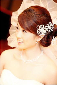 改成側邊的編髮包頭,搭配抓澎的頭紗,跟耀眼的杯冠
