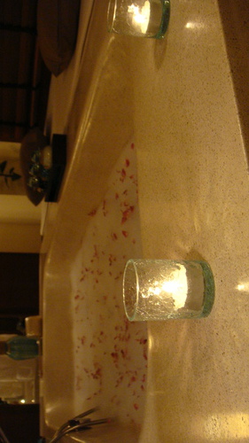 把燈光調亮~滿浴缸的玫瑰花瓣~搭配泡泡~~真的超夢幻阿