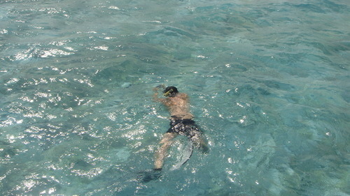 我馬上攀住他的脖子~靠他的浮力把自己撐出水面拔掉呼吸管
