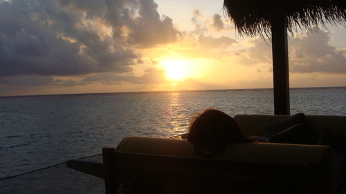 躺在陽傘下喝香檳看夕陽