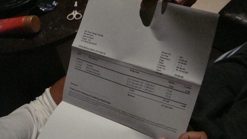 隨信附上前三天的帳單~讓我們先核對帳目~以便明天check out 的速度可以更快
