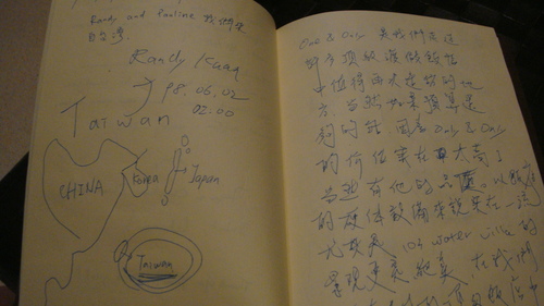 這個先生很可愛~還畫出台灣的地圖~標是說"台灣在這裡啦!"