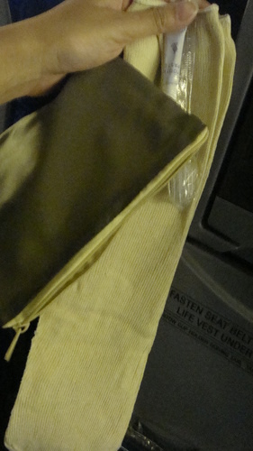 這次除了枕頭毯子之外~多了一雙襪子~還有牙刷牙膏耶!