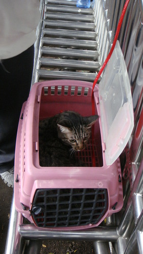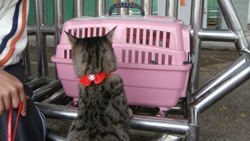 把牠抱出外出籠~牠還是會跳回籠子裡