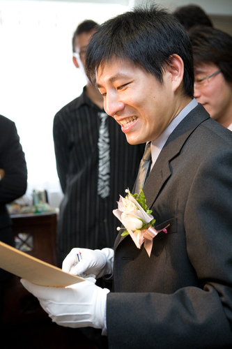 在婚攝的提醒下~新郎掏出了紅包打算收買伴娘