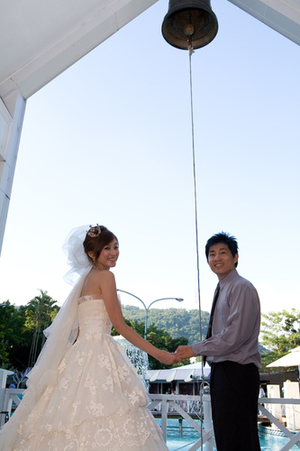 最後我們想出折衷方案~由新郎一隻手敲鐘~~我抓著他另一隻手做樣子