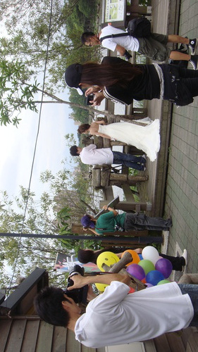 在雨中拍照~測光跟橋pose的時候~大家幫新人撐傘