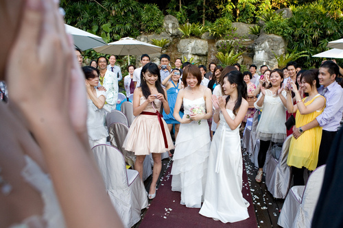 退場的時候紅毯兩邊的賓客拋出了粉紅色的玫瑰花瓣