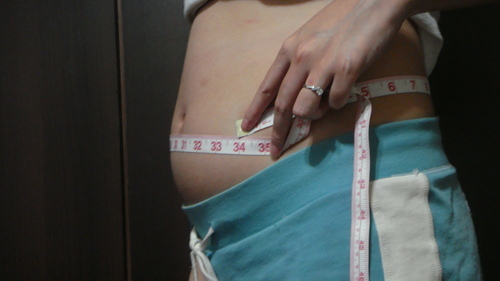 今天買到了皮尺~量了一下肚圍~33.5吋咧(照片的量法是錯誤示範~正確要經過肚臍喔)