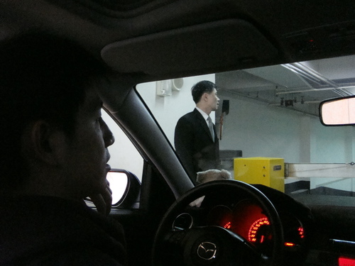 只好在停車場門口等...後面陸續出現了3台車~~開始排隊咧