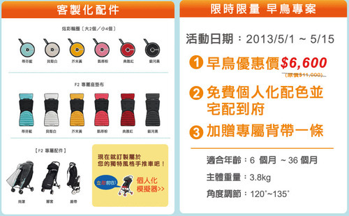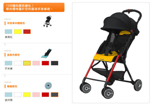 最酷的是多達108種的顏色配件組合,讓您量身訂做專屬您的個人化推車,繽紛點綴育