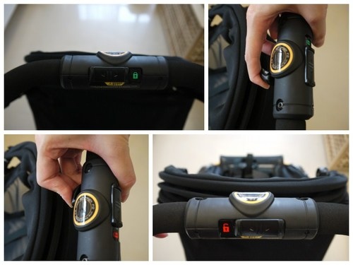 將安全鎖往右推看到代表警告的紅色解鎖鎖頭~此時就可以按下下方的開關器收放推車
