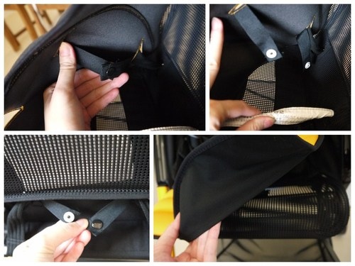 3.坐墊背後屁股位置的安裝扣解開 穿過椅背 在椅背後方扣上