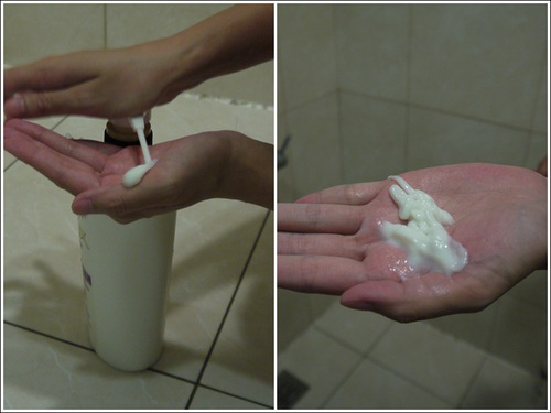 接下來使用柔亮絲滑潤髮乳~輕壓壓頭膏狀的潤髮乳就出來了~第一下不小心壓太大力差點噴到地板上