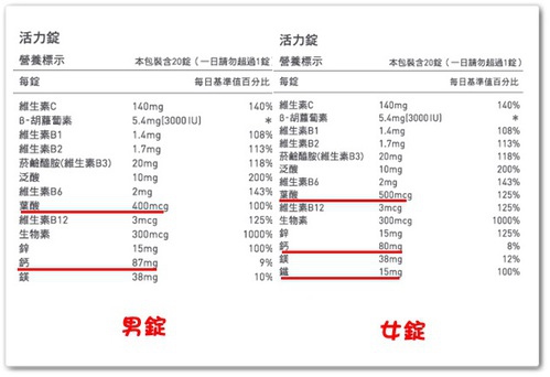 活力錠最大的不同在於女錠增加了鐵並加強葉酸的量
