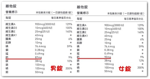 所以總結鈣的部分一天份的量男錠比女錠多了12mg(甦齡錠一天是兩顆喔)
