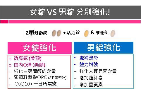 女錠的配方另外增加了鐵 葡萄籽萃取 與輔酵素Q10