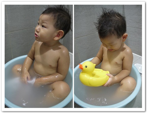 先用清水幫小允洗澡後,再將沐浴油加到水中給小允泡澡