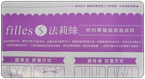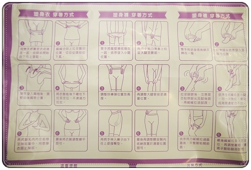 包裝袋上已經印好法莉絲各種塑身產品的穿著方式教學