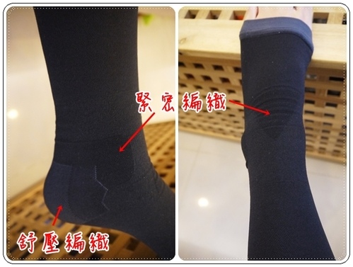 另外就是針對腳跟部分是採用舒壓編織,比較鬆,可以輕易的拉開包住腳跟而不會造成太大的壓力,但又不會走動摩擦就往上捲