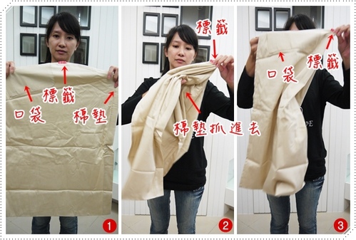 1.首先要請大家注意這三點:口袋 標籤 棉墊,只要注意這三個東西的位置變化就能快速上手