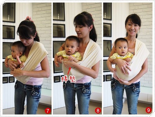 6.有棉墊的一側轉到下面,將背巾開口朝上的方式套過頭跟一邊的手,像側背包那樣