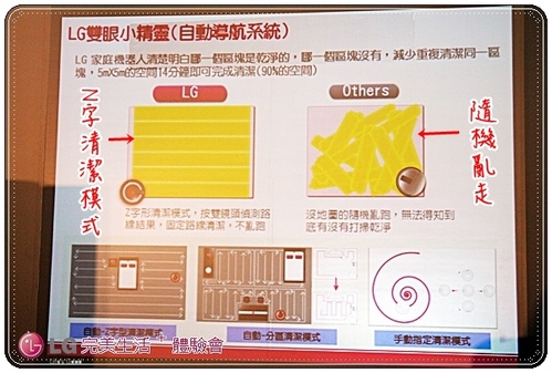 可以看到LG是採用Z字型路徑打掃,花費時間較短且幾乎沒有留下黑色未清掃到的部分