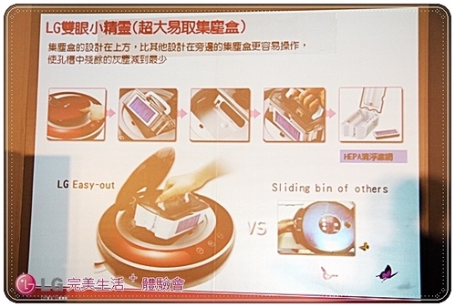 有別於它牌清潔機器人的集塵盒做在側邊,LG的集塵盒開口設計在正上方,空間更大也更好拿