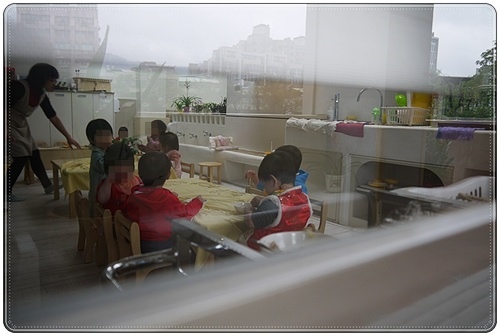 我跟老公到教室時,看見小朋友們圍著桌子正在吃午餐,老師抱著小允一直哄