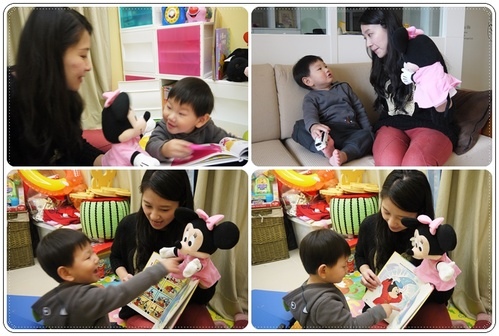 小允出生後,喝完奶清醒的時間,我就會放迪士尼的CD,抓著小允的手腳玩
