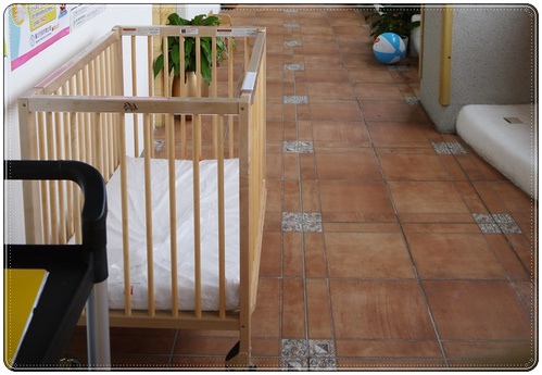 後來發現老師們會用嬰兒床載好幾個不太會走路的小孩在走廊上走來走去