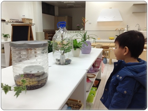 蒙特梭利另一個特色就是環境崇尚自然,所以不只教室布置像在家哩,也會有盆栽螃蟹這類生態