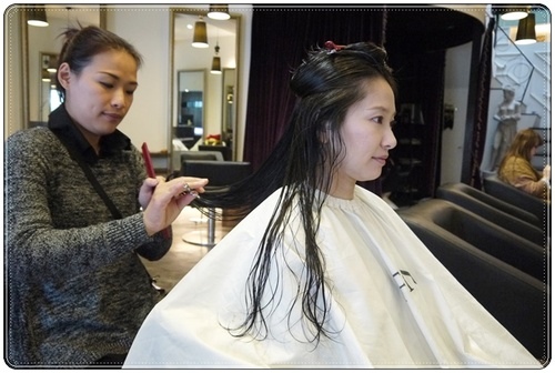 洗完頭沒有吹乾,設計師Kalin就過來幫我進行"濕剪"