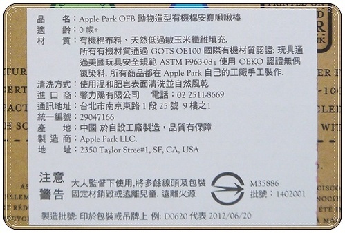 包裝側面印有apple park產品獲得的國際有機認證以及Dr. Toy 最佳綠產品獎章