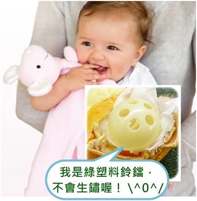 尾端的搖鈴採用的是再生無毒綠塑料,不用擔心口水沾濕後會生鏽