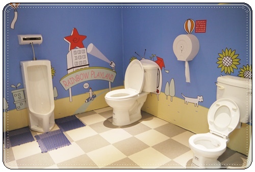 兩間廁所都是男女共用,風格設計不同,第一間是藍色的