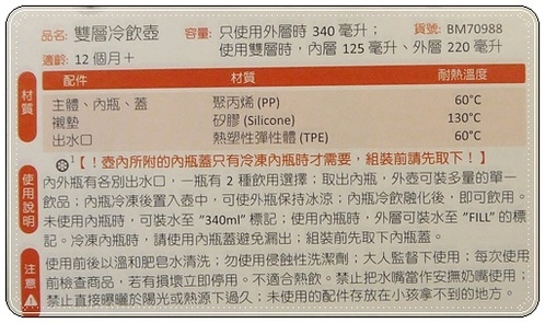 來看看材質,耐熱只有到60度,是專門裝"冷飲"的水壺喔!