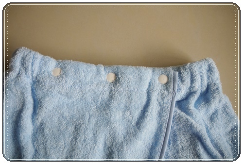 浴裙的釦子+鬆緊帶設計,不會緊到不舒服又固定的很好,自由活動也不會滑落喔!