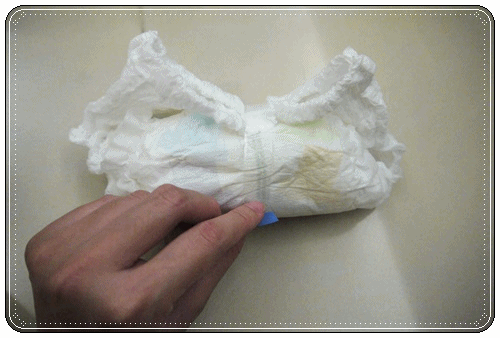 換下來的臭布布只要捲起來,然後將背面的黏貼條往前一拉固定住,完全不沾手喔!