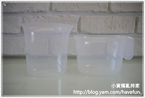 而瘦高這個量杯則是測量水量用的,要特別注意他兩面的刻度並不相同喔