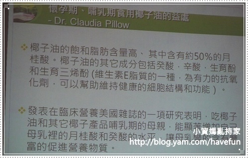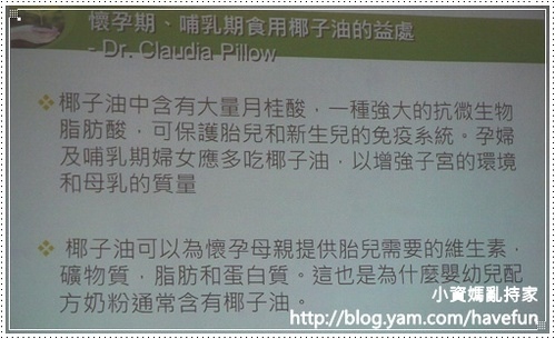 首先介紹的是椰子油,原來椰子油所含的月桂酸對孕婦跟新生兒都很好