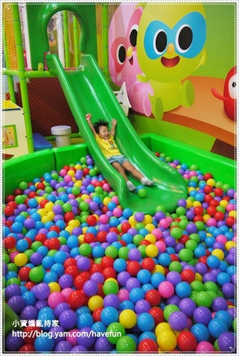 上樓梯的右手邊,就可以玩溜滑梯一路溜進球池裡頭囉!
