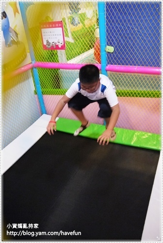 溜滑梯右邊的通道進來,藏在樓梯後方是一張好大的跳床喔!
