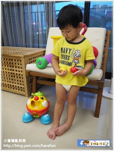 當我在忙碌的時候,小允就自己把球球先生抱到我身邊,坐下來邊丟邊唱歌自己玩很HIGH