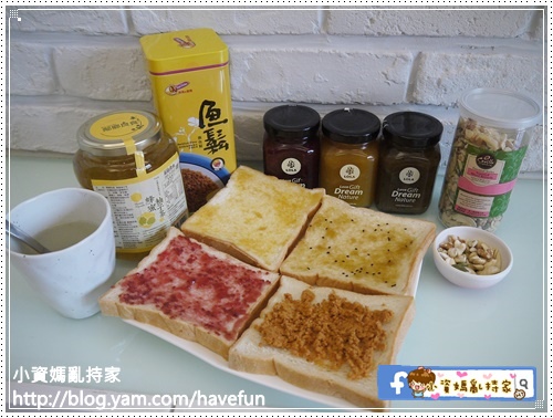 把果醬跟魚鬆夾在一起吃,鹹甜鹹甜的,是我的最愛啊!
