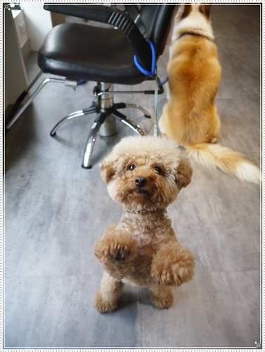 大隻的繩子比較長,朝我蹭個不停,小隻的紅貴賓因為繩子短距離遠,整個吃醋到站起來雙手揮個不停超可愛