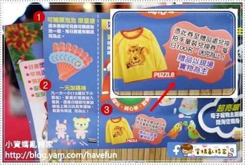 禮物有3個,1是泡泡,2是一元抽,3是前100名的拍手童裝兌換券