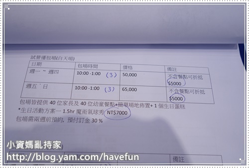 包場價格依時段不同金額不同,含40個大人+40個小孩餐點,場地布置,生日蛋糕,包場時間為3小時