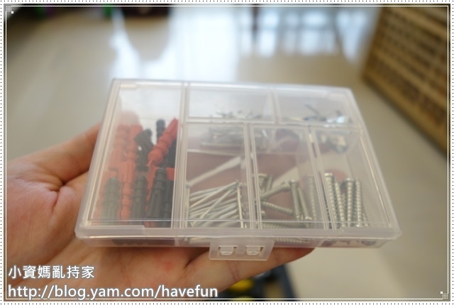 還有附一盒小五金,裡面依照不同螺絲大小種類分成5個分隔,非常實用喔!