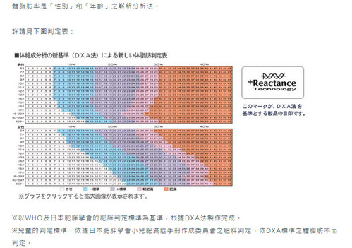 原來是計算方式不同,Tanita採用DXA法製作的表格,更詳細的列出了不同年齡的體脂判定標準